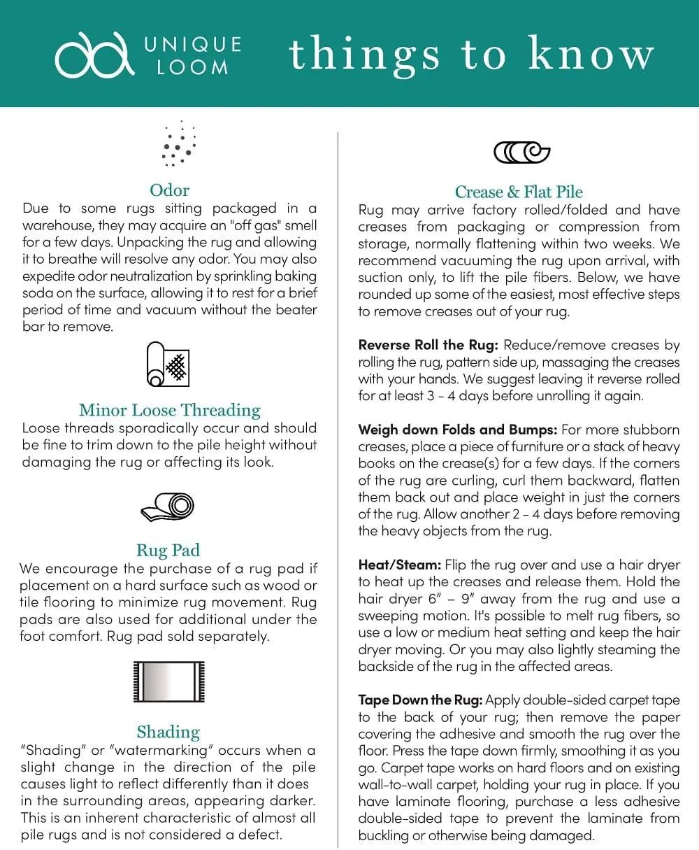 6. SHIPPING: Rug will arrive factory rolled/folded and may have creases from packaging & compression from storage, flatting over time.