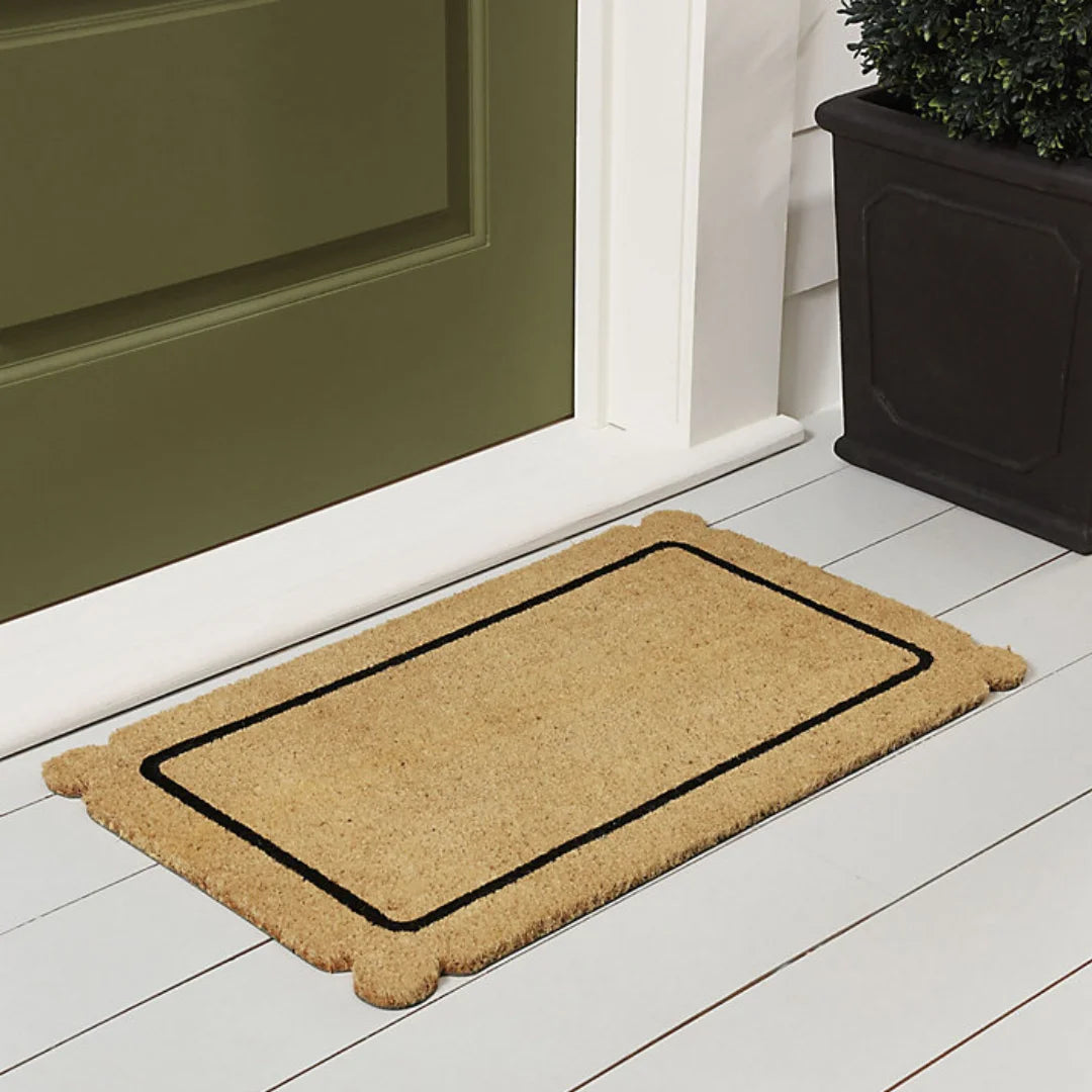 The stylish lobed corner design is hand woven of natural coco fibers and stenciled in graphic black using fade-resistant dyes.